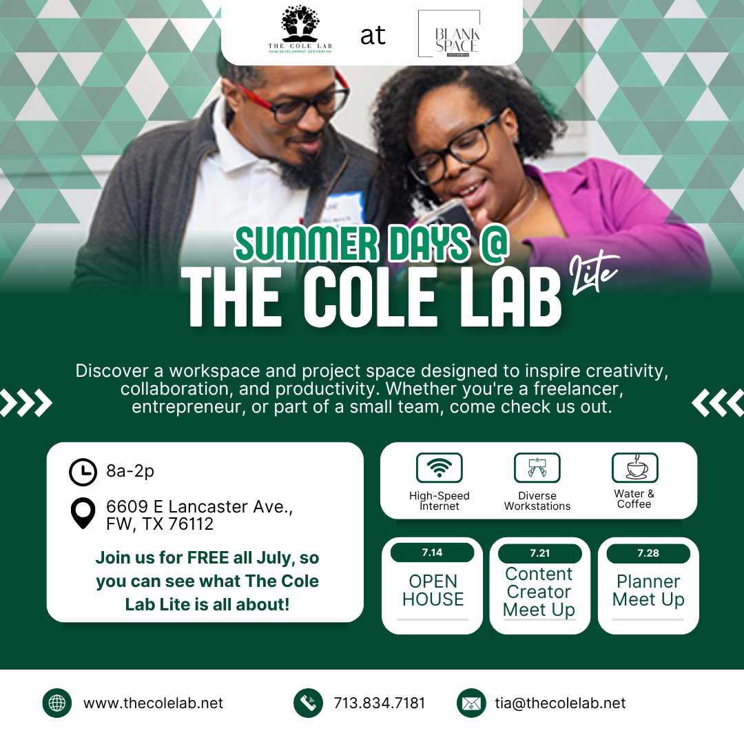 Transform your Mondays from mundane to monumental with The Cole Lab Lite! We've created the perfect space for ambitious professionals and driven entrepreneurs to connect, collaborate, and cultivate their careers.